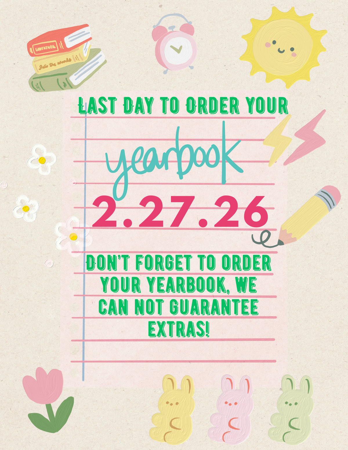 The last day to order yearbooks is Friday, February 27th. We are not guaranteed extras so make sure to grab one before it’s too late. Use this link and search for Yarbrough Elementary. When yearboo...